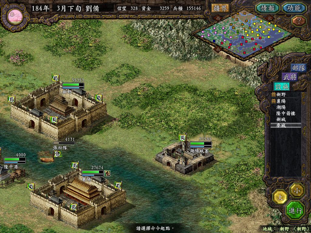 初步计划是,开始全军拿下湖阳城塞以打通两城之间的联系,同时也多了一个恢复兵力的地方,由于主战场肯定是在新野,最强的赵家军和关家军都放在这个方向。效果如何,得通过实战检验,呵呵~