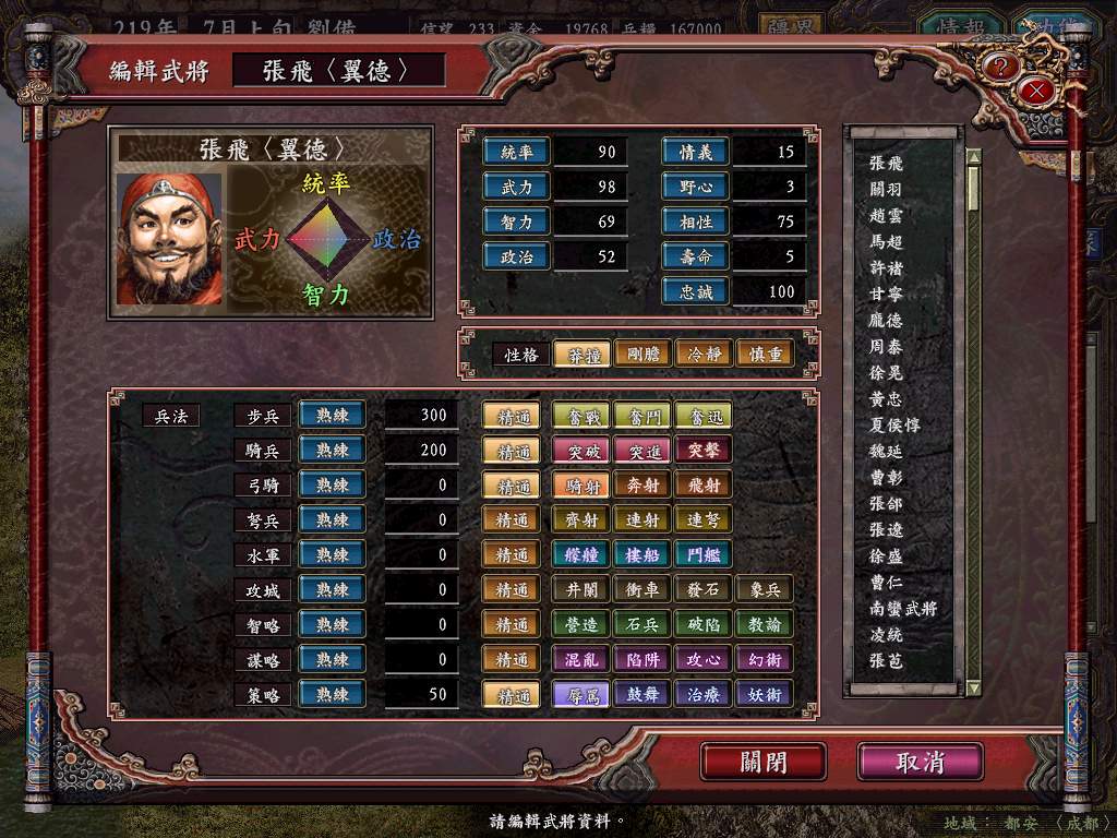 兵法上,我觉得张飞应增加骑射/齐射,毕竟人家在三国演义里也是射过箭的,虽然没有射中马超,但凭他敢射这一点,他在弩兵/弓骑上就应该比关羽强,后者好象从未射过箭。还有他应该精通策略,但熟练读可以射低一些。重新设定后的张飞见下图:
