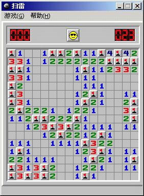 寻找常见的数字组合,这通常会指示地雷的常见组合。例如,在一组未挖开的方块的边上相邻的三个数字 2-3-2 表示这三个数旁边有一排三个地雷。