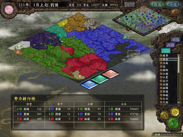 初期的战略,西城新野人口不多不利于发展,因此必须拿下一个城。环顾四方,襄阳必须从江上走没可能,汉中短期没可能,就只剩下宛和许昌了。前期,我方总兵力大概也就三万人(征完所有兵役),只能用打蛮族的方法调开主力部队再攻城。从两个方面分析偶选择了许昌,一是交通状况,宛就一条路,搞不好攻城部队就和电脑被调开的主力碰上了;二是许昌内政状况强于宛,许昌乃全国第二人口大城还有商人常驻,利于发展,再者许昌辖下的颖川可是一个无中生兵的好地方而且还能顺便加钱加信望。