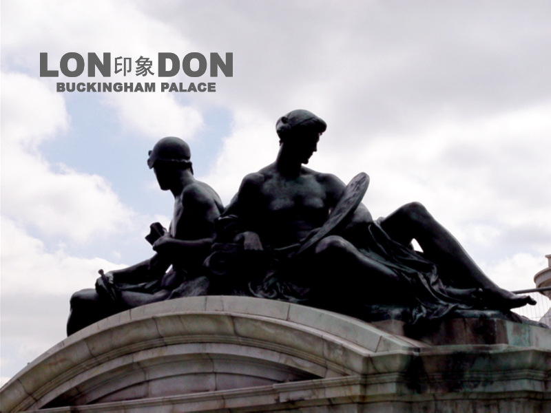 环顾白金汉宫四周,最吸引我的是宫前高高在上的胜利女神金像。金像下面,雕刻着四位杰出女性,当中,伊丽莎白二氏坐像庄严的注视的前方。