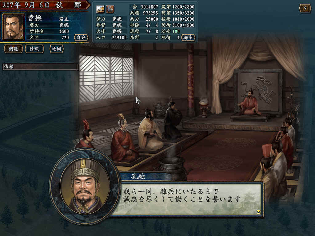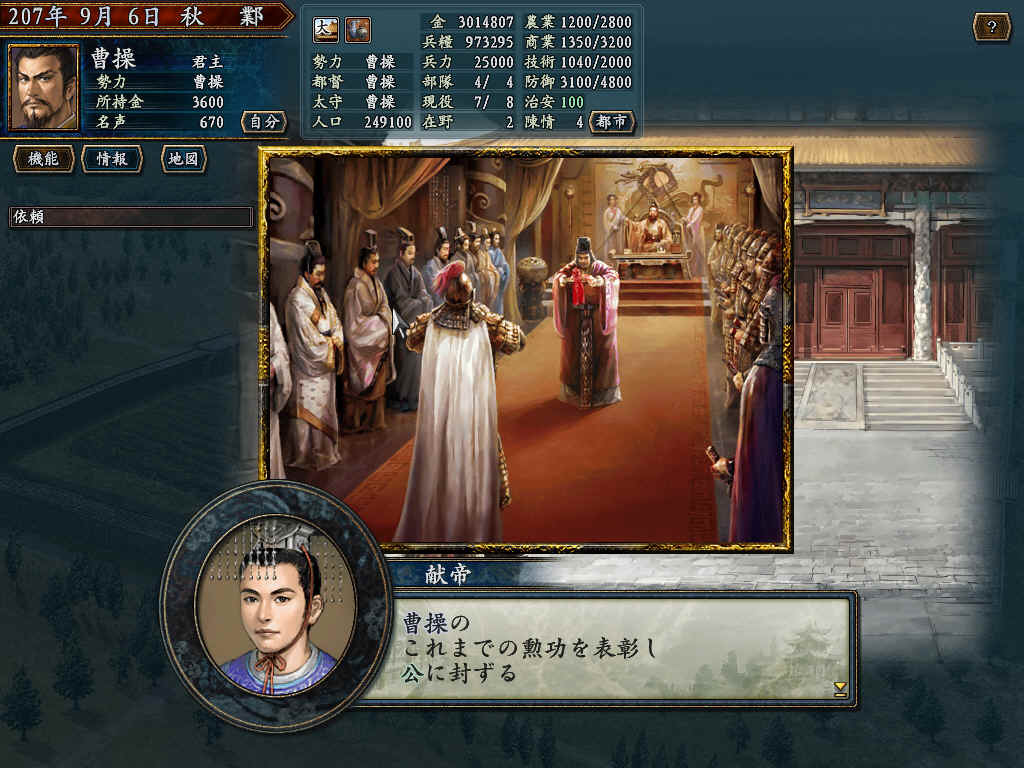 用207年剧本;发生袁尚被灭;程显计策使得老曹绑架徐庶老母;河北统一;获得官爵公!曹操必须首都在邺;城市规模为大;治安100;走进农地发生!
