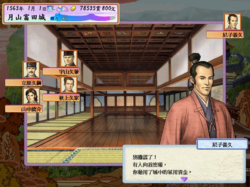 选第一个年代,开始的奖励点数把武力加到80,其他全部加到统率上,此时的我还是一个刚刚出道的步兵队长,头一次开会就惊闻三刀屋城主三刀屋久佑叛投毛利家的噩耗,从此主公一直心灰意冷,除了汇报任务再也不见任何人.没办法,咱人微言轻,先好好锻炼自己好了.第一次任务选倒卖军粮,赚个几千贯以资家用,然后去商人那里将几个统率+10,武力+10的东东收入囊中,哦,还有个价值7的茶器,社交必备.然后后面每月的任务都选修炼,经过不懈努力,已经顺利将洋枪,骑马,医术和算术升为三段,我也升为步兵大将,这期间白鹿城陷落,尼子家只剩下最后的坚城月山富田,浓郁的失败气息在家臣中弥漫着,开会的时候发现佐世元嘉等人也叛逃到毛利的阵营中了.会后山中担心士气太低,于是到训练场巡视,发现宇山久兼散家财提升士气,而且我为了能更好的发挥自己的能力,要求久兼将自己和秋上久家升为侍大将.下月开会,主公竟然说久兼犒赏士兵的钱是挪用公款,要久兼剖腹自尽.幸好自己曾在训练场目睹一切经过,救回久兼性命.不出10天,毛利大军就已兵临城下,15000对8000的悬殊力量对比,1561年,月山富田终于没能守住,主公降了,久兼切腹,逃出来之后和秋上久家商量寻访尼子家的后人,一定要复兴尼子家.