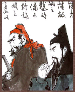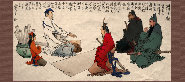 昔有诸葛武侯,怀伊吕之才,有萧曹之能,人谓之卧龙。其时谪居南阳,躬耕隆亩,以待天时。逢昭烈屯新野,咨之以王者之道,凡三顾乃见,遂得据荆襄以向宛洛、取益州而出秦川之计。昭烈用之而功成霸业,武侯以之亦名垂宇宙。今有西蜀后人,神游故土旧国,感怀古圣先贤,不能自已,遂写斯图以纪之。(壬午年二月)