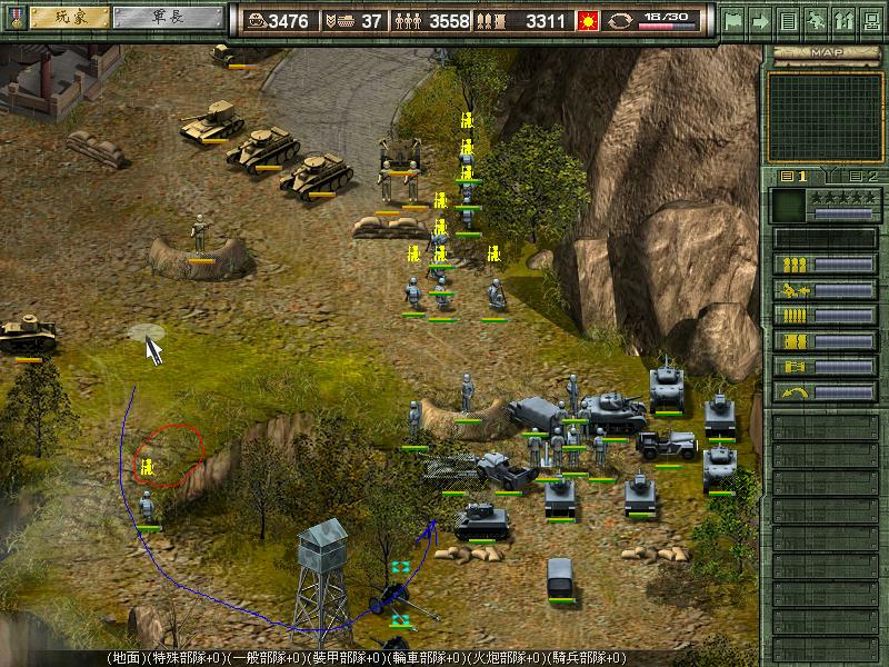 我的参战部队是4个大刀队、4个轻步兵,1个重步兵、一个游击队、一个迫击炮和一个运输队。我玩的版本是硬盘版,可能不是1.06版。
