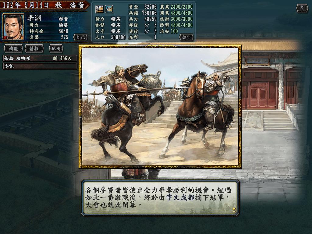 这是李渊大军第一次出兵,军容强盛,左首是长子李世民并大将殷开山、右首是次子李元霸并大将马三保,李渊居于中军,但见大军盔明甲亮,气势迫人。