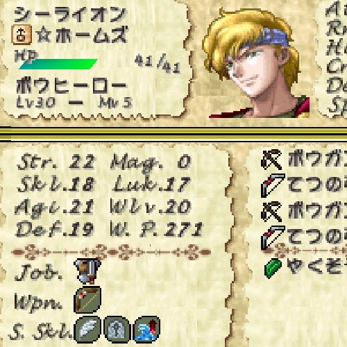 霍姆斯首先要清空一直靠近的敌人,直到几乎没有敌人能直接靠近躲在最左上的西根再向处点突击.敌人的进攻不会打到霍姆斯的,所以那着龙弓一直前进就好了.龙弓也能一回合灭掉敌人的Boss,这关复活剑掉了11把,用了22回合.算是正真正明的消耗战~~