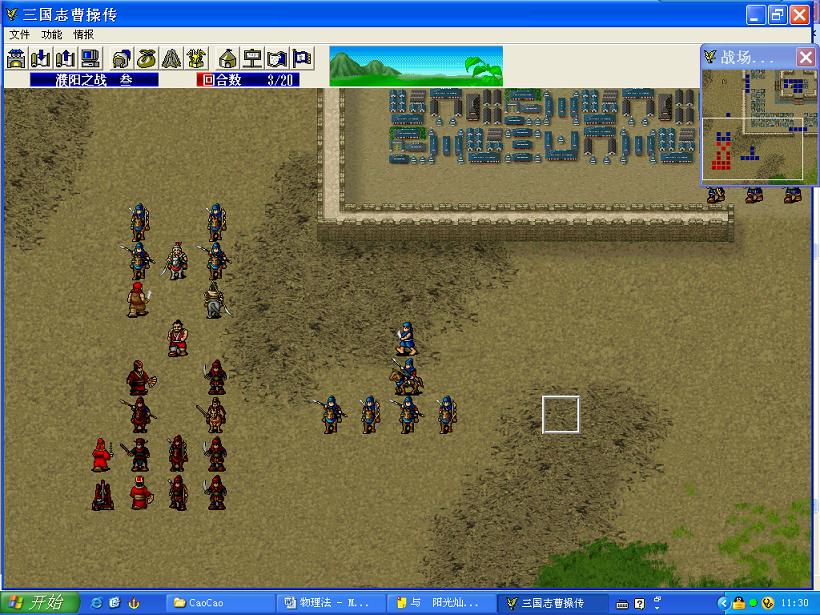 第二关,汜水关之战。宝物分配真是麻烦。短剑、弓和不穿的皮铠卖掉,只练武力果。宝物衣服全穿上,曹操带青囊,夏侯惇带玉玺,曹仁六韬,曹洪龙鳞铠加太平要术,乐进铁盔,夏侯渊吕布之弓,李典三略(衣服不够皮铠)。保证打二十回合就行,打的时候竟然发现没带豆子,友军也挂了,最后剩下两个李肃和弓兵,s/l好几次。