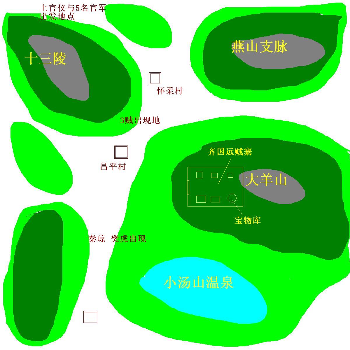 本关开始上官狄在西北出现,最好加入一些对白,譬如:\n\n上官狄:这次送往京城的贡品非同小可,万一出现差错,大家的身家性命都恐不保。\n\n副将:听见了没?上官大人嘱咐了,大家都要务必小心行事!\n\n官军:遵命。\n\n开场设计,上官仪走三回合刚好进怀柔村,村子出现一村民,与之对话。\n\n村民:这位客官,可要往西南去?\n\n上官狄:正是,不知老伯有何指教?\n\n村民:客官,本来这里一直很太平,可最近对面的大羊山上,来了个姓齐的占山为王,拦截过路客商,抢劫财物,这不商人都不敢从这走了,客官可要小心了。\n\n上官狄:多谢老伯指点。\n\n副将:看来有些麻烦啊!\n\n过了怀柔村接近昌平村,出现3贼拦路,2贼被官军击退,一贼逃上山报齐国远,有关对白由 喝太阳 设计下吧。然后齐国远、李如圭冲下山来拦路。\n\n这时,从最下面的村子出现秦琼 樊虎,\n\n秦琼:北面隐约有喊杀声,过去看看。\n樊虎:二哥又要多事,打架有什么好看的?\n秦琼:路见不平人人踩,怎可坐视不顾?\n……………喝太阳的补充\n\n\n然后----二人参战,建议齐国远、李如圭带15贼左右。宝物库宝物考虑兽皮衣之类的,大羊山是动物的乐园,自然兽皮衣可以在选(考虑虎皮衣之类的,术士增加防御用的),其他按原先的设计进行。\n\n胜利条件25-30左右,全灭敌人。