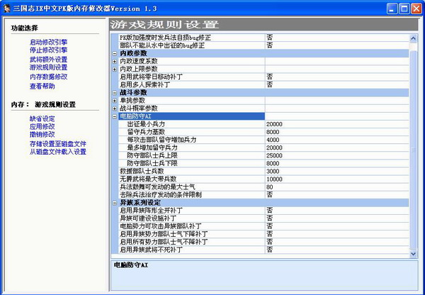 设置游戏规则设置、武将扩展参数设置及内存数据修改