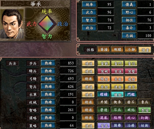 智力和政治的资质是卓著,统帅和武力资质只是普通