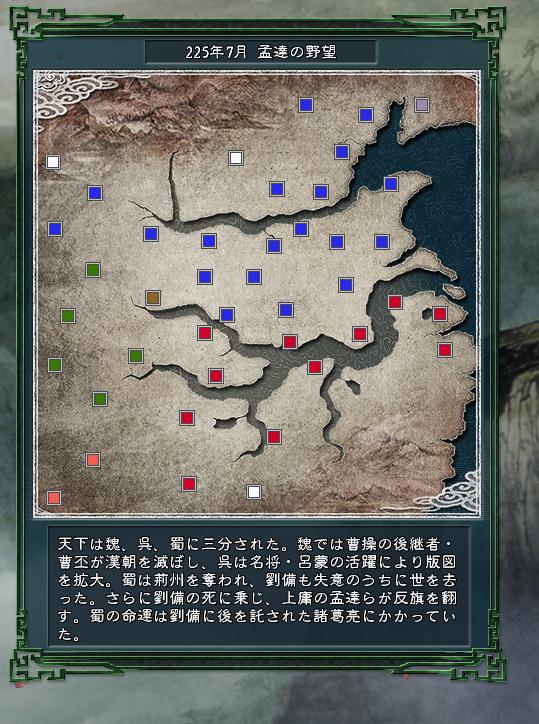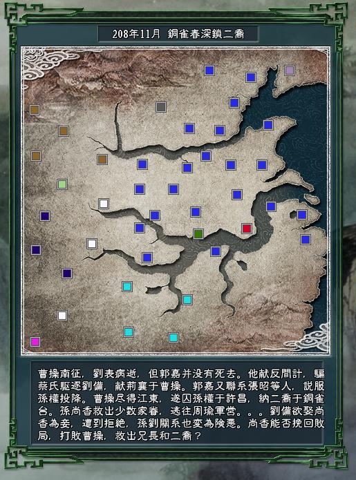 孙权投降。曹操尽得江东,遂囚孙权于许昌,纳二乔于铜雀台。孙尚香救出少数家眷,逃往周瑜军营。因周瑜拒绝投降,正与郭嘉交战,中计大败。柴桑被曹仁军团乘虚攻占,手下诸将战死,被俘,投降者极多;大将甘宁,太史慈也不知下落。此时的刘备也刚刚在长板被击败,逃往江夏暂避。刘备之妻子尚存,便要求纳尚香为妾,结果被拒绝,两家关系也因之变得不和。正当曹操在铜雀台的众多美女陪伴得以的时候,商曜却在他的后方造反,攻陷晋阳,壹关;马超,韩遂也攻破长安,潼关等处(当时的马腾,马铁,马休都在邺当人质/俘虏,君主是马超)。此剧本有诸多入手点,孙尚香可以和周瑜联手,救出孙权和二乔么? 刘备可以克服困境,重兴汉室么?马超可以杀进邺城,救出父亲和弟弟们么?商曜可以完成他“四足鼎立”的梦想么?曹操可以在铜雀台安度晚年,高枕无忧么?这一切的一切,就要看玩家的如何扮演您的的角色了。