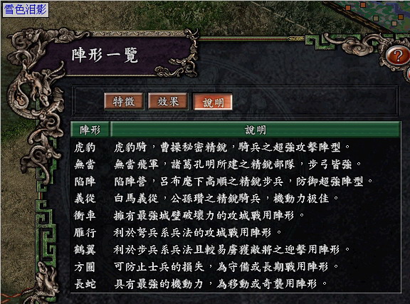 诚如 快哉风兄 所言:“三国志九的剧本也出了很多了,精品剧本不说大家也知道,再做下去也不会有太大的突破了,但我总觉得三国九中阵形有修改了必要,一般大家最常用了也有四五种……”因此在下斗胆做了这个全新阵型修正剧本,意在抛砖引玉,希望大家勿以见笑,哈哈哈!