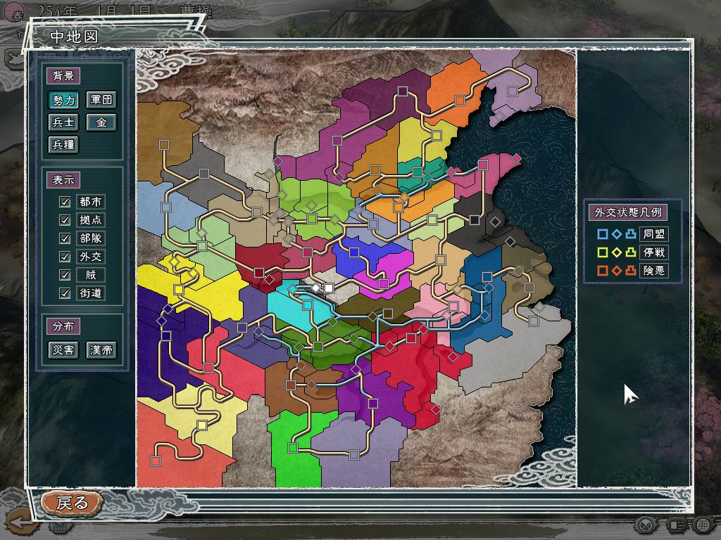 42座城市中有41座分别被41个势力占有,空出一城让玩家建立新势力;第一版所有城市分别被42个势力占有