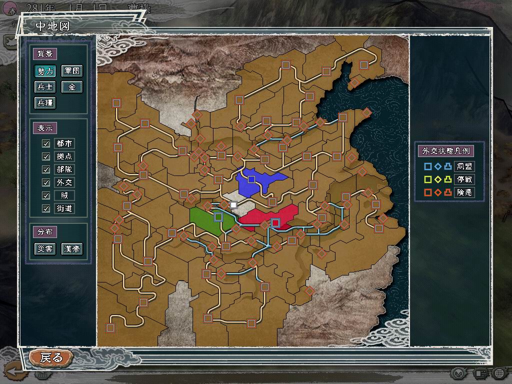 以官方剧本作为参考,所有被占领的城市,金钱、兵粮、耐久基本改为2倍,士兵数均跟官方剧本相同,空城除耐久改为2倍外,其它均为0;第一版所有城市的金钱为10000、兵粮为100000、耐久为10000、士兵数为20000