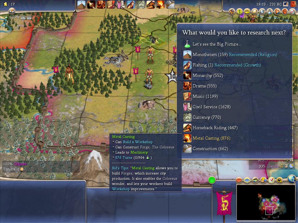 科技方面,按惯例是青铜优先的,不过看看这副图,食物实在是短缺,自然成长的话恐怕得NN年后才能利用上大理石,权衡再三,还是首发动物驯养了: