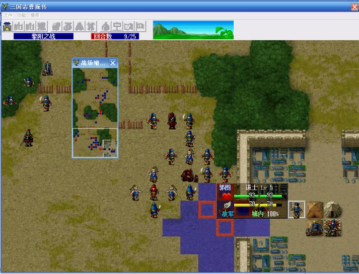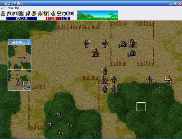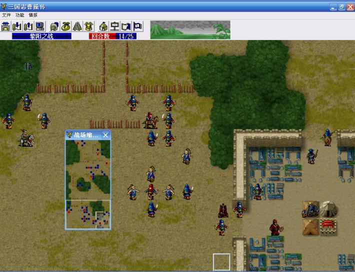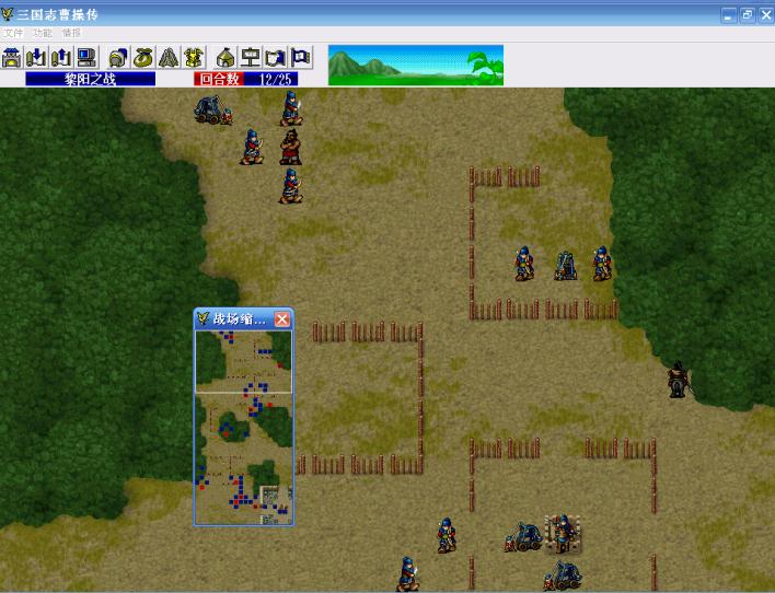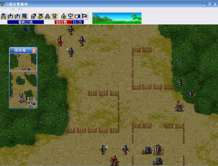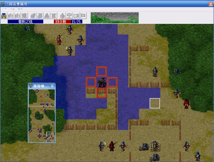 第一回合,典韦凭借爪黄之力,进入区域(0,0)-(19,28),也就是越过第一道栅栏,引发栅栏里的7名敌人主动出击,曹操引一个弓兵,不要让他挡典韦北上的路,张辽引那个步兵,曹仁往上走准备过栅栏,其他人往袁谭所在的城里走。