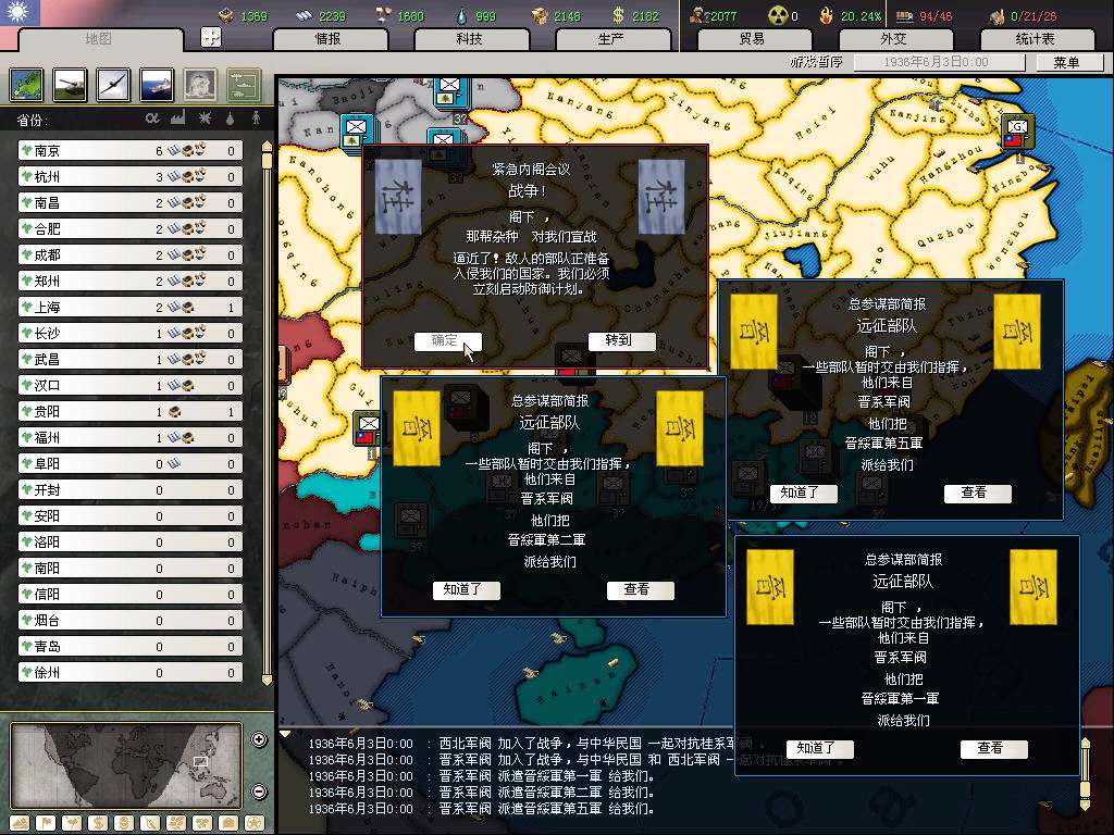 开局打算是攒钱拉英国关系,等和桂系和平后,入盟买图纸(当然运气好的话,资源和图纸也都会很送一些,就更省钱了;这代的图纸太难偷,10个间谍才5%,不抱大腿拿图纸,chi的科技组就是杯具),然后赶在77触发时间结束前(8月底)退盟入中国盟,伟大的抗日战争不容错过,而且这样要完成几个抵抗事件所花的代价也小了。