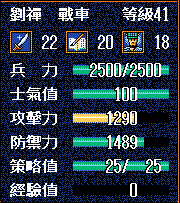刘禅,武力22,智力20,统率18,西陵第一回合作为41级战车加入。