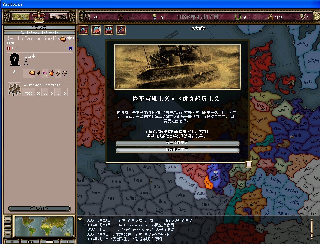说明:把所有的国家的人口增长率从1.0改成了0.994。法国的为0.992,奥地利的为0.993。(原版这两国的增长率就相当低,原版法国为0.9936,奥地利为0.9978,大概是这么多吧)这么做的原因是使游戏到后期不至于人口膨胀,一个国家几十亿人。另外,此战报不使用恶魔提款机,南北库叶互换,割地攀科技等BUG。不过远征军偷渡法,厌战赔款等BUG还是会适当用到。