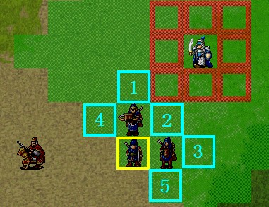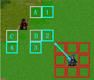 曹操传中的距离计算并不是简单的数一下格子数就行了,还要算上地形对移动力的影响。所以这里不说“距离最近”,而说“移动力消耗最少”。那么这个“位置”又是哪个位置呢?当然不是攻击位置,否则就没必要特别说明了。这个“位置”是指攻击位的上下左右四格。看下图:AI到ABC三个白框的行动价值相等,这三个白框往上下左右各延伸出四个格子,除去对方贴身四格和AI移动范围外的格子,剩下1234四个有效格子。AI到23两个格子消耗的移动力最少,所以会优先选择这两个格子,最终移动到B框。
