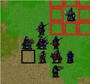 下图,当我军进攻到一定程度,打通吕布通往弓兵的道路时,吕布就会朝着弓兵移动,选择移动力消耗最少的一条路线,按照上右下左的顺序走到图中的白框位置。