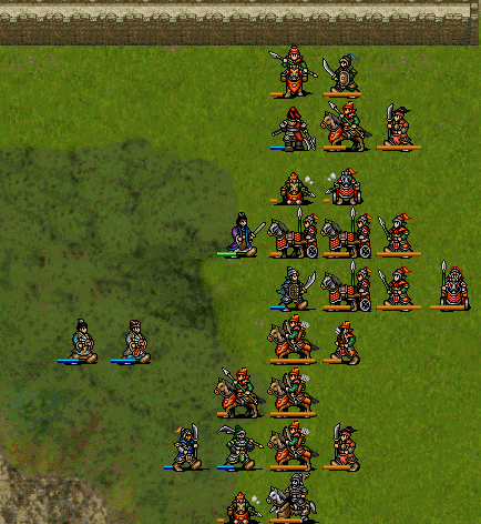 第一回合孙坚后撤,集体往前走一点,小夏侯走到袁绍前面步兵的斜下方把敌人的一个步兵勾引过来砍他(还有个弓兵也会过来射他)敌军阶段黄盖程普撤退。