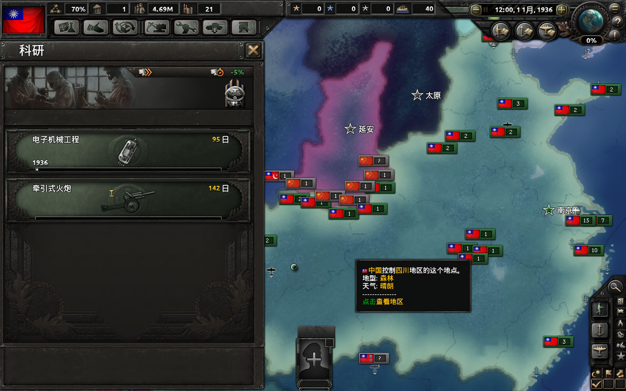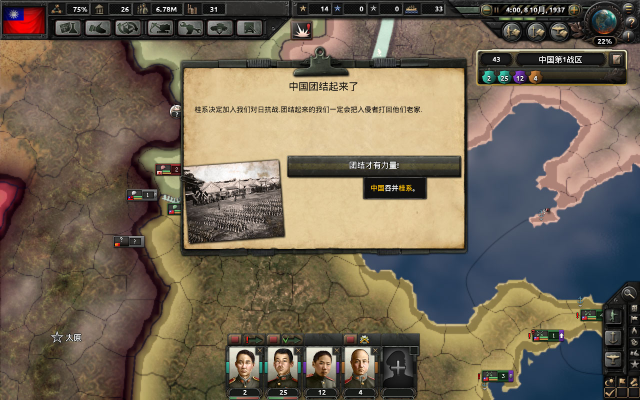 共21个国策,吞并日本前研究完要点开最后一个科技共享,吞并本子后土共会退出统一战线,之后没阵营就点不了了