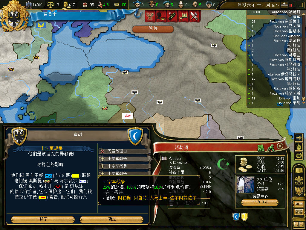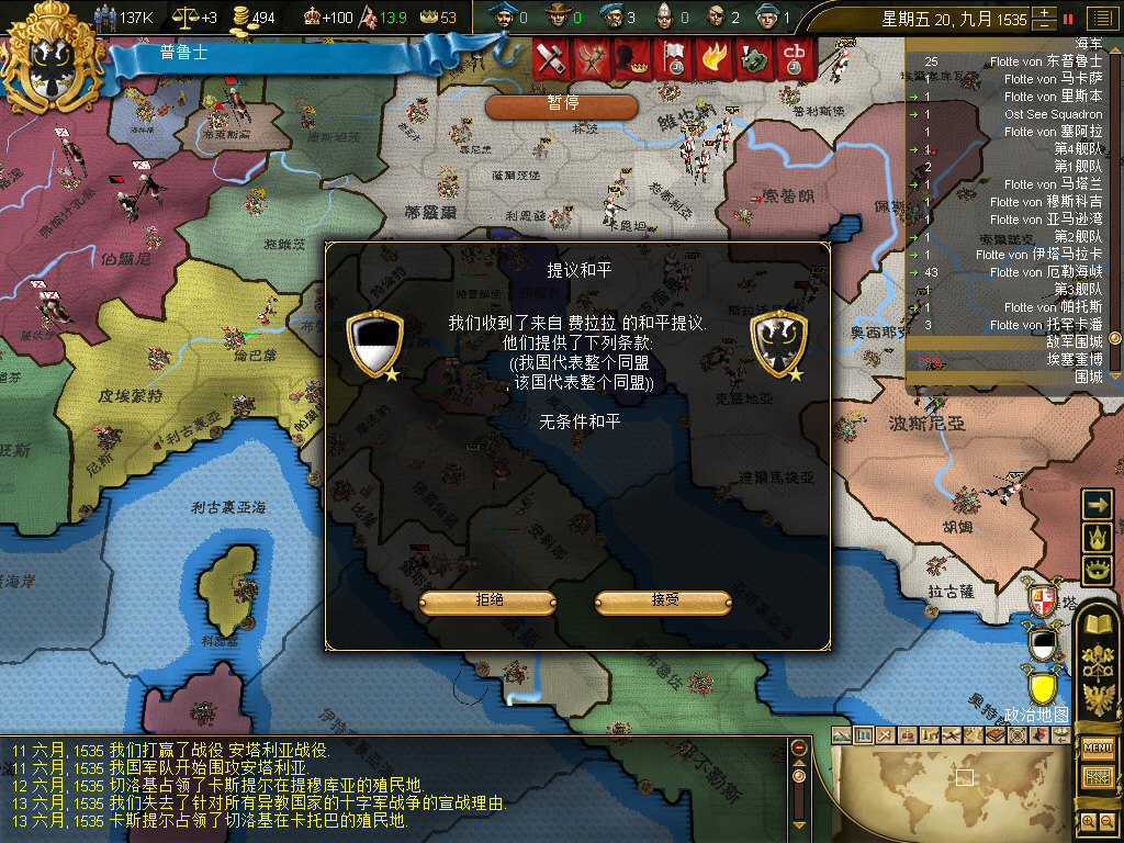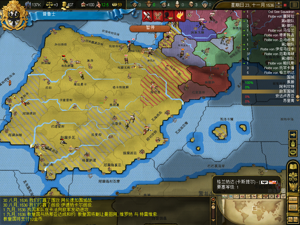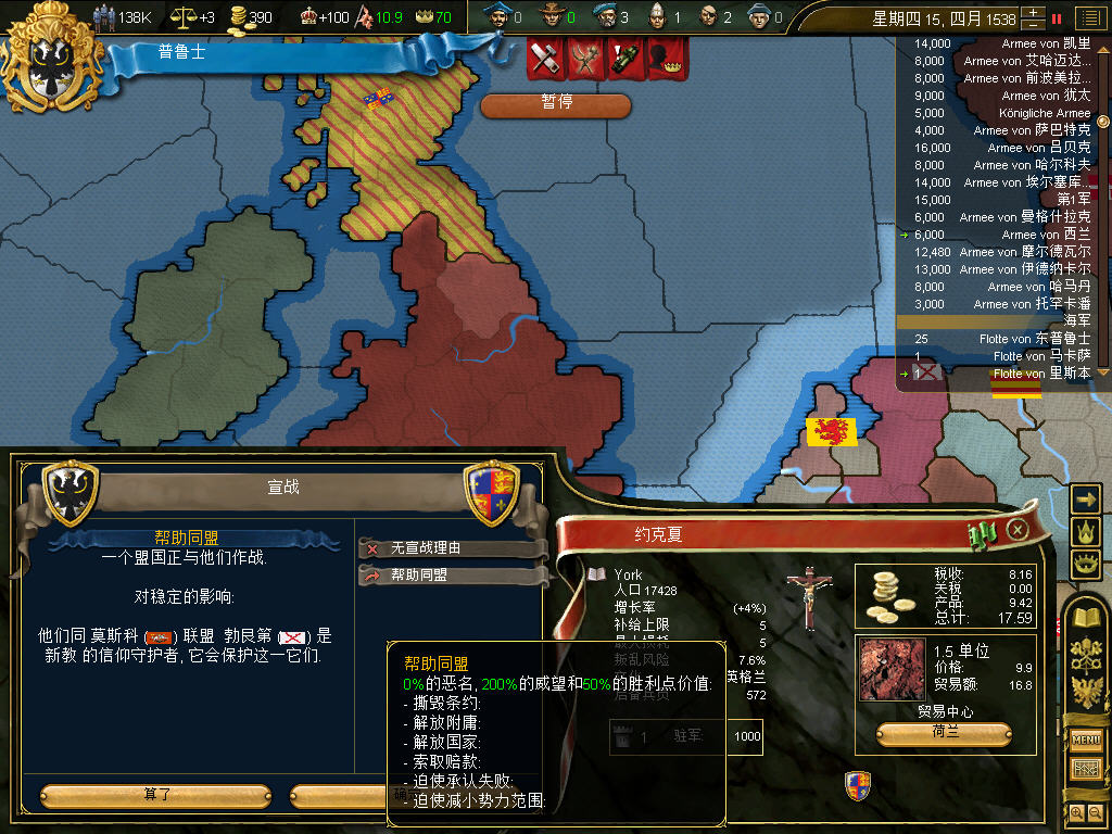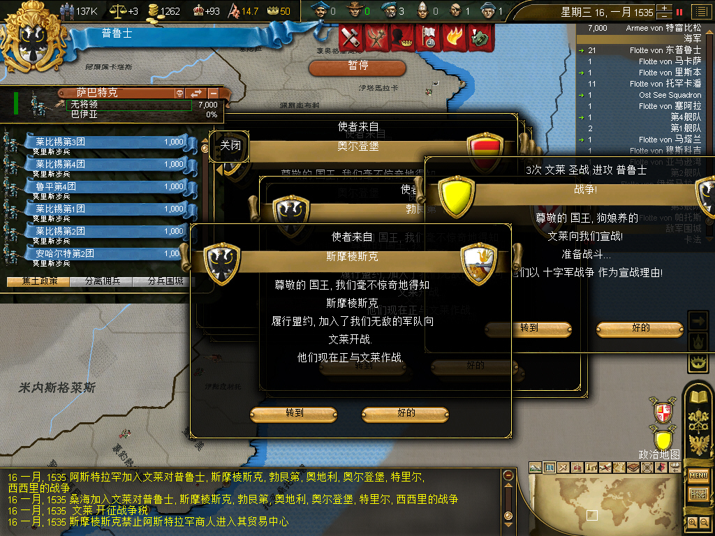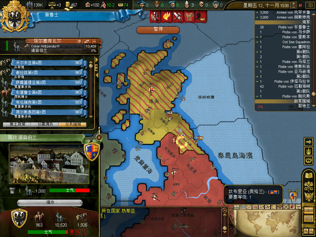 割了奥斯曼十多块地后,又来了国土过度扩张的debuff,+3的叛乱,而普鲁士第一任国王是前条顿的大团长,接班人是大团长的养子奥兰治家族的Wilhelm Friedrich,所以大团长一死,正统性跌倒了20,又加了叛乱风险,将近一年多,什么事没干,净平叛了