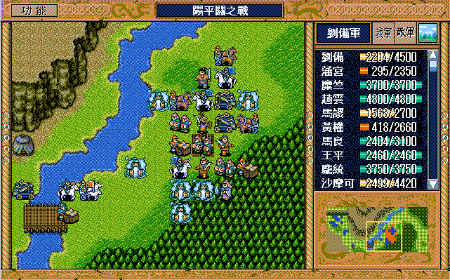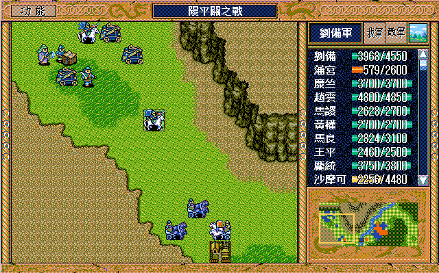 本战曹军声势浩大、精锐尽出,但我方亦非浪得虚名。征战大半天下的刘老板调配有度、从容应对,经过45回合的鏖战,终把阿瞒打得漫天飞“翔”。由于有杨修、司马懿及运输队,所以敌军兵力完全不用担心。名将打人还确实疼,于是仅有的三个普通骑兵和一个武术家就入了刘辟彀中,他的翻身仗就在此一举——前期反击二人并反击死一个普通骑兵,后期策略补够后就可以在刘备、赵云及刘封的帮助下反击武术家和另两个普通骑兵,最后还带着这三个拖油瓶组成了阳平关休闲旅游六人团。刘辟的春天终于到来,此战又多抢了大半级,今后只要再抢个四、五下反击就达到终极目标了,只是稍微影响了点藩宫和陈式的经验,但是有张郃、曹洪两员升级大将(后叙),损失几乎可以忽略。话又说回来,许昌I的反击资源都是藩宫(和魏延)的,许昌II的反击资源基本都是陈式的,到时刘辟不抢功,还是他俩来享用。本战有三人可以升级,张郃、曹洪不难,一接触就能升级,但许褚的升级是个大问题。之前他在徐州II和汝南各用了2次策略积32点经验值,要升级需用9次策略,他只有40点策略值,那么他仅能用1次挑拨,其余8次只能牵制或激励。靠着中前期降张郃及夏侯惇的士气可以提供中后期激励3次张郃及1次夏侯惇的机会。张郃倒没什么,而且兵力补充也充分,但是过早降夏侯惇的士气,兵力下降较多,就会影响司马懿过来的那回合(第25回合)的站位,他就不会进树林到他该到的地方。即便算他4次激励,加上最后剩4点只能用牵制,那么还得用3次牵制,这才是极极难的地方。就算S/L到吐一地,也未必能见到他用牵制,我也只是在多遍重打的过程中见过1次,更别提3到4次了。更为关键的是,即使经过天文数字般的S/L到他升55级也要34回合了,此时陈式56级、藩宫54级,已经不影响大局了,顶多略有遗憾,毕竟过了阳平关就不需要敌军升级了。所以许褚升级就是个鸡肋,还是放弃了。糜竺到43回合可以升90级,可为我方多提供策略恢复,前期调配好藩宫和陈式的行动方式,最后一回合正好潘宫、陈式、庞统都可以用大火龙,加上吴兰还可以攻击一次,就可以把梅花五的敌军全部消灭,虽说没什么大影响,但看看还是挺爽的。