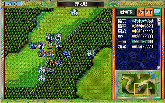 我 吴兰右一援助、黄权上激励吴兰,刘备下假情报骑兵2,马良左下补给刘辟,刘辟牵制弓兵6,糜竺进村庄激励陈式(从此不变位置),陈式上攻击步兵5,马谡上激励藩宫,庞统下一,藩宫右一上二大焦热(失败),刘封右援助藩宫,王平右援助陈式;