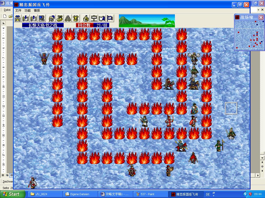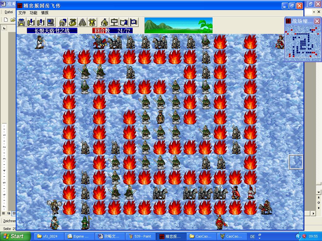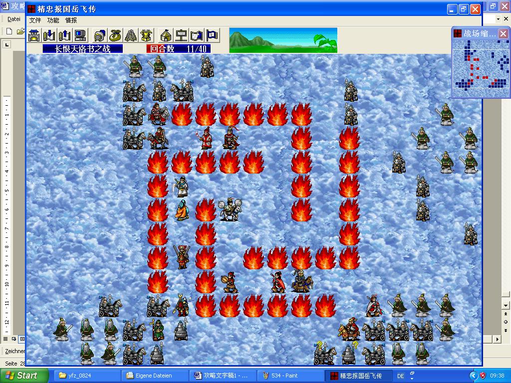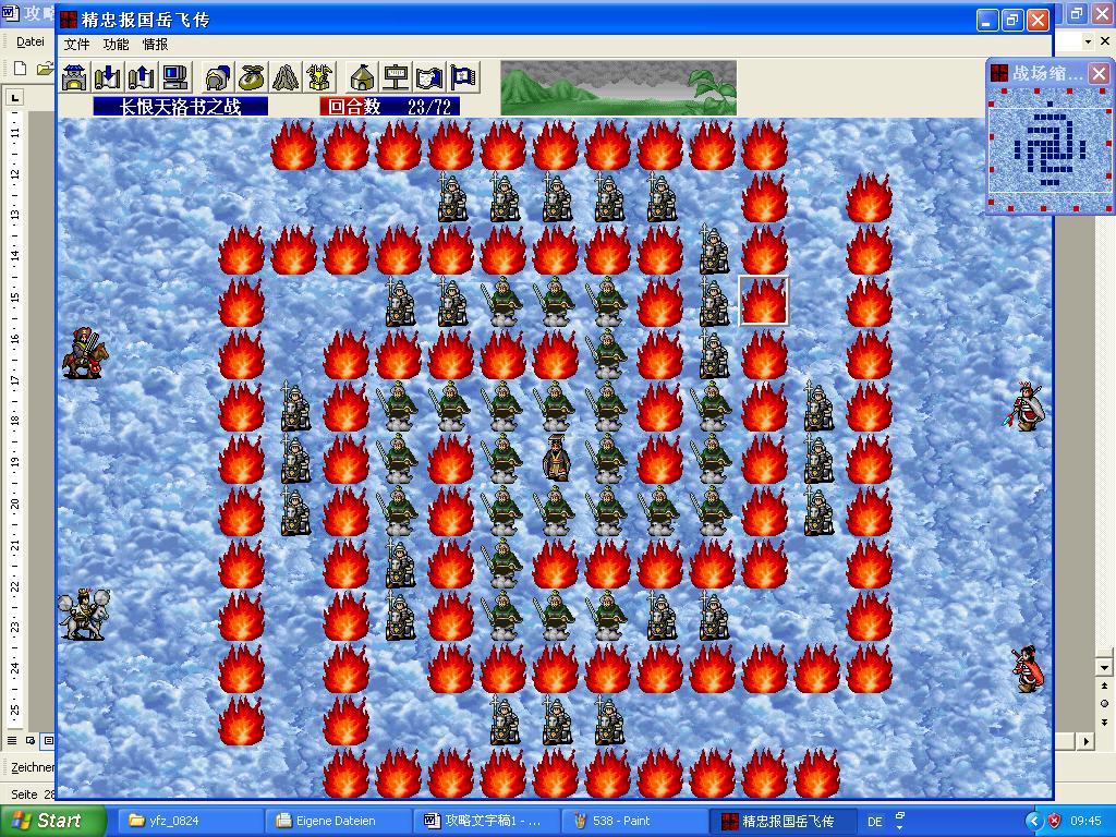 第三阶段总结:这一阶段是最后一关真正难点的开始,火焰的保护之下,我军的生存其实根本不成问题,只需派加了防的武将在前面顶住就可以了。这阶段的难点是进攻,但在普通装备下,各种特殊的攻击效果消失,进攻也变成艰难起来,只有慢慢磨了。如果将敌军引到火焰保护之外,可以增加一些攻击点,但我军的防御也会变难。