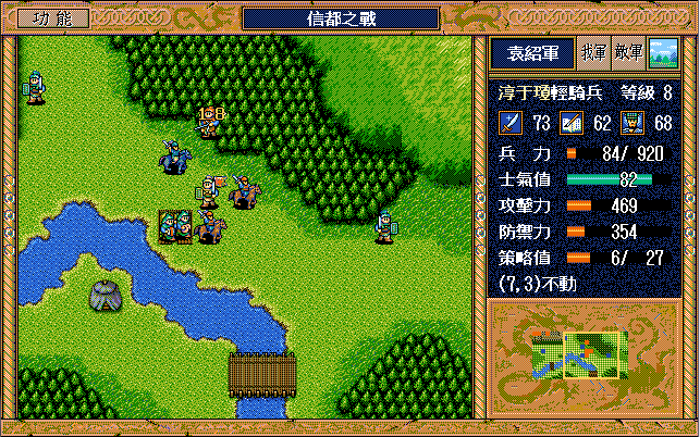 敵 步兵2上1,張郃原地牽制劉(成功->士氣60),運輸隊左上援助張郃(兵力滿)