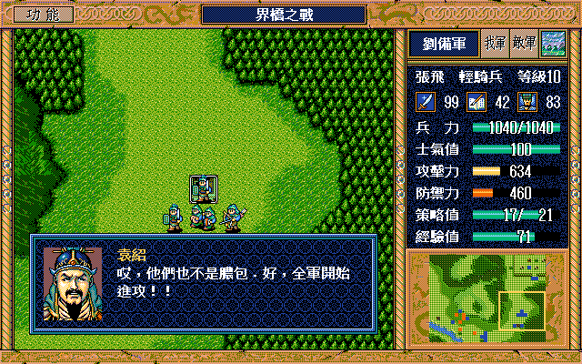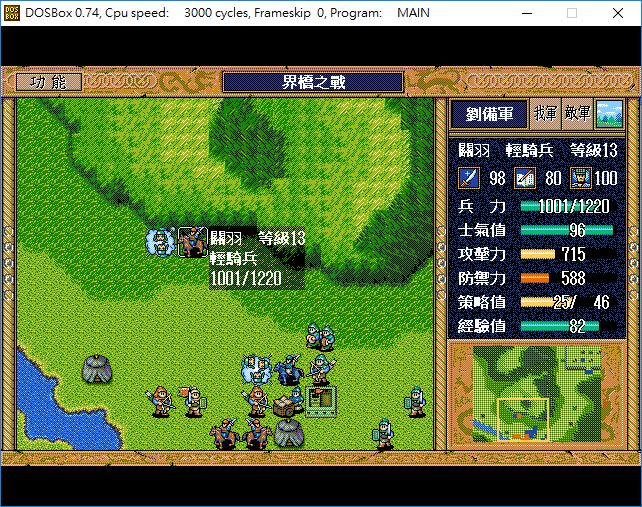 我 關原地攻退逢紀,張左牽制並單挑退顏良>張升級,簡原地漩渦 藩原地焦熱 劉(進鹿砦)左攻張郃=>戰役勝利,全軍50點經驗。