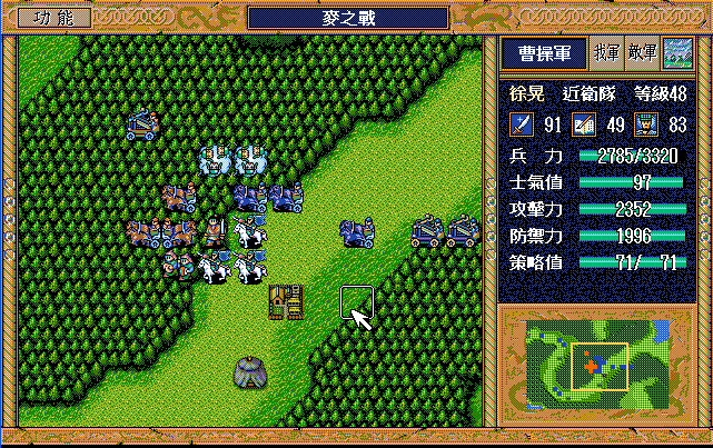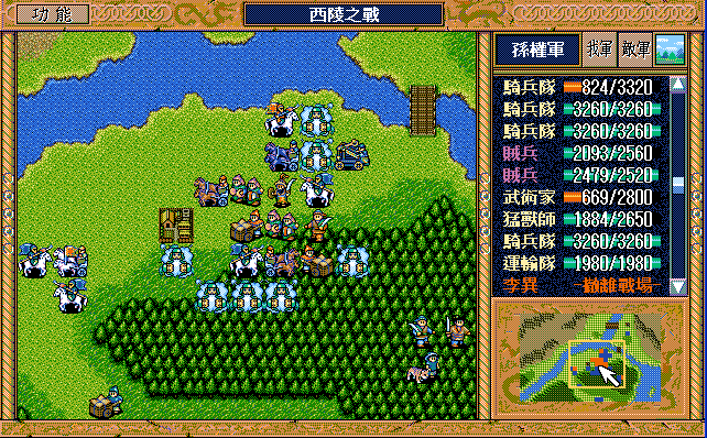 第24回合后:孙桓援助的差不多了刘备把骑兵混乱,放孙桓下来攻击马良,刘备绕过去准备卡位,沙摩柯在合适的时候灭掉上方步兵,让孙桓到这个位置,这样才能大策略吃主将。运输队醒来后大救济,然后到村庄左侧补给骑兵,糜芳混乱之,不能让他进村,否则后面没法利用村庄给骑兵补血了。魏延左侧骑兵血量不足时进村挑拨糜芳,左下骑兵醒来上移攻击魏延,运输队左下攻击魏延重新成阵,然后糜芳混乱村中骑兵,刘备攻击严畯并卡位,严畯醒来开始援助魏延下方骑兵。后面主要就是sl敌军的援助对象,敌军两个贼兵的策略真讨厌,中间用过若干次策略,否则还能多反击几下,体力是足够的,最后只能反击死猛兽和武术家,两个贼兵体力基本满的。