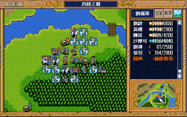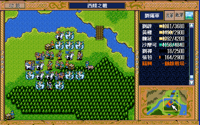 第5-10回合:魏延后退攻击步兵,把骑兵引到桥上方,然后刘辟断后,刘备魏延当前锋过桥,中间控制敌军步兵的援助对象。