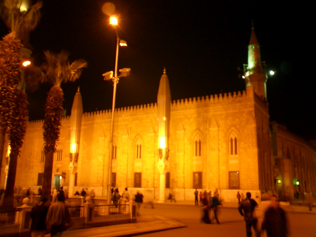 开罗另一座著名清真寺 -- 侯赛因清真寺的夜景。傍晚坐在侯赛因清真寺旁的咖啡馆门前,抽着水烟,喝着黑黑的埃及咖啡,看着汗•哈里里市场上商人和买主大声的讨价还价,听着从喧嚣鼎沸的嘈杂声中传出的阿拉伯音乐,真仿佛置身于一千零一夜的童话故事里。
