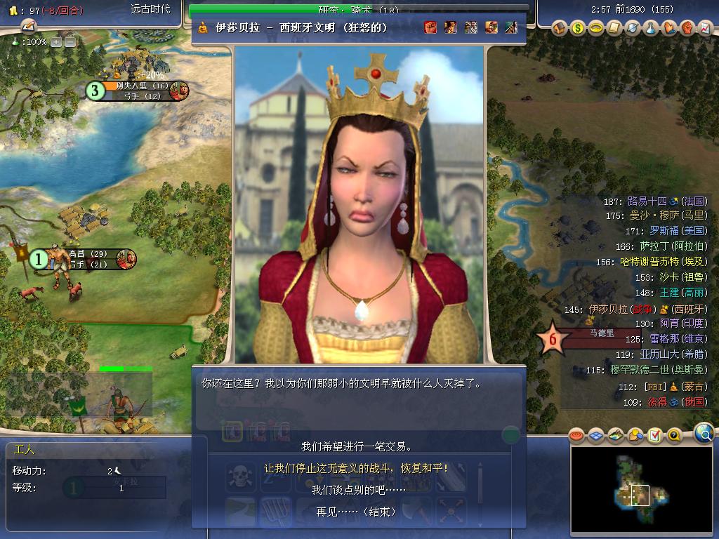 同时我的又一副城高昌也紧挨着马资源放下了,此时,守马德里的守兵突然出来要袭击我高昌,还有3回合就到我领土了,而我家里已经倾巢而出,所以暂时和解一下吧,这次签了和约,因为我需要时间发展一下下。这里保持战争状态的好处就出来了,因为从战斗开始到攻破对方城池,我一直没与伊妹子谈和,所以当我拿下巴塞罗那的时候能够马上与她和解,不然如果我在攻城前开战的话,在后面由于不能马上和解,这盘就会输在摇篮之中了