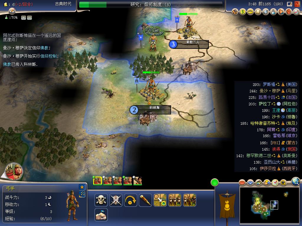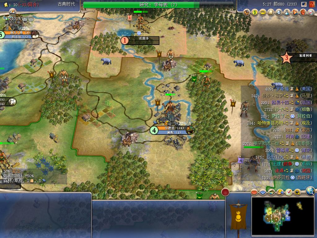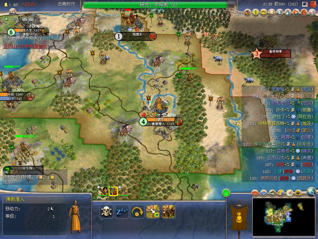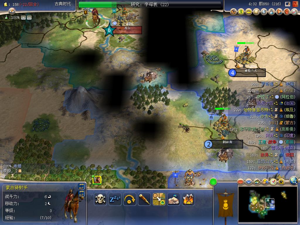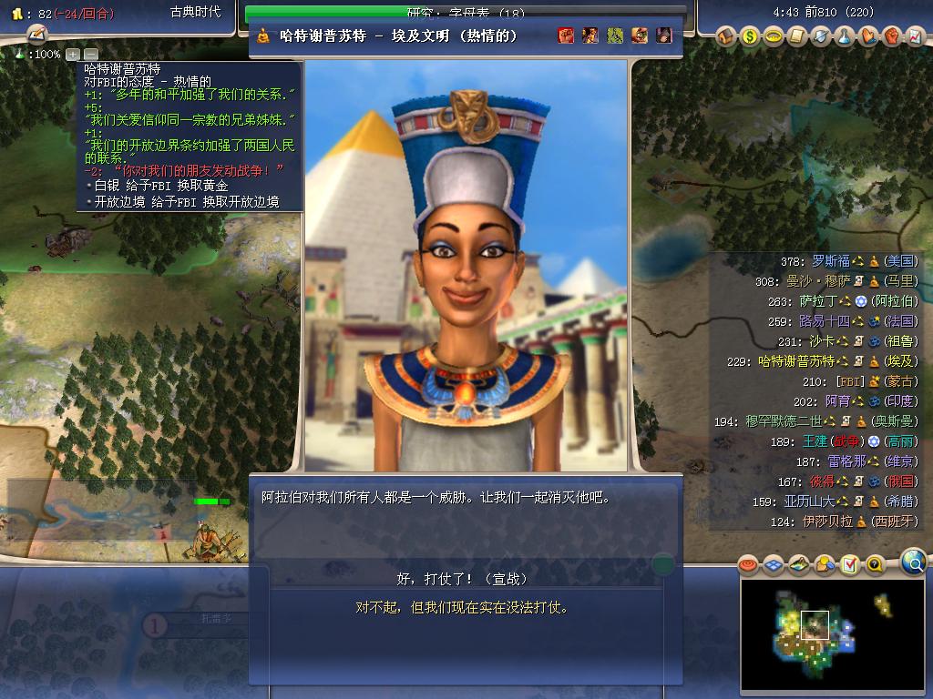 顺便说一下,埃及MM(黄色)已经在我北边沙漠地区放了3座城市(地图上能看出来),正好在我和老萨(最北的淡绿色)之间,在后来起到很关键的作用