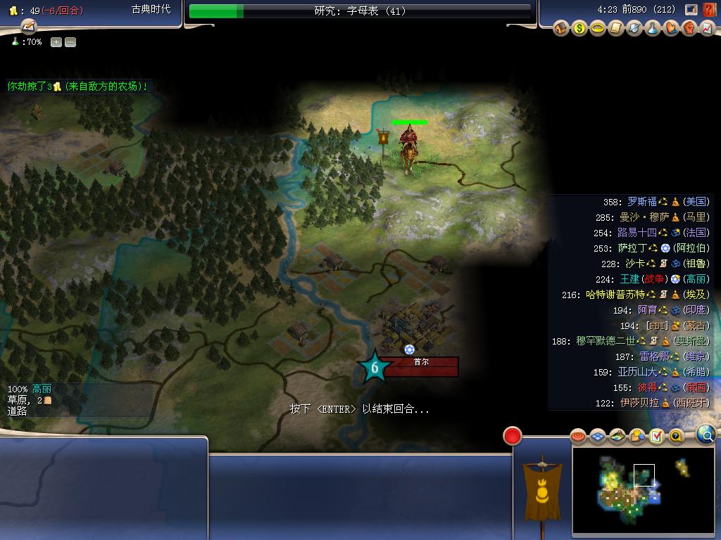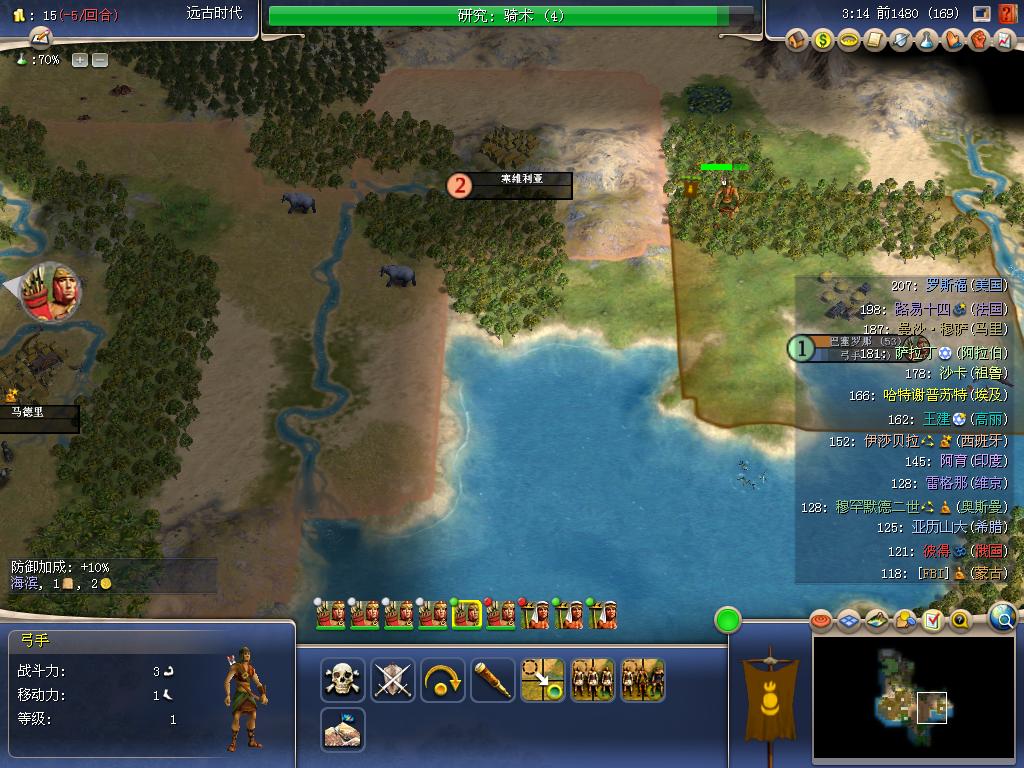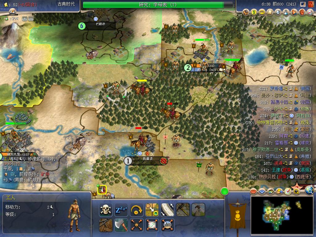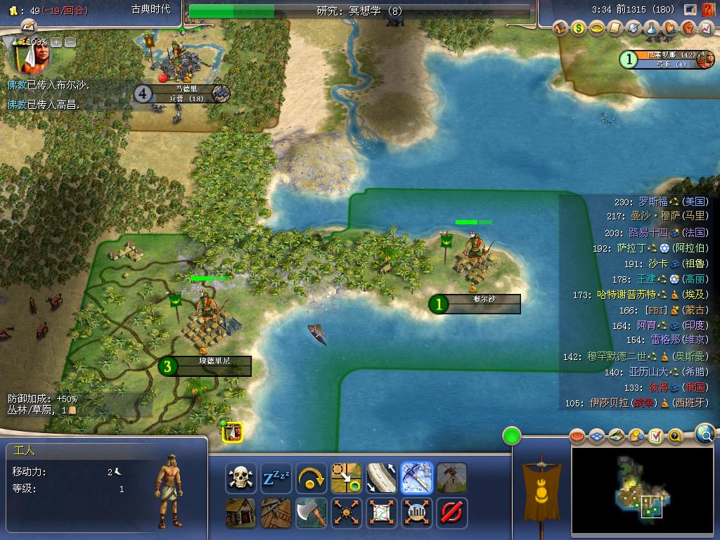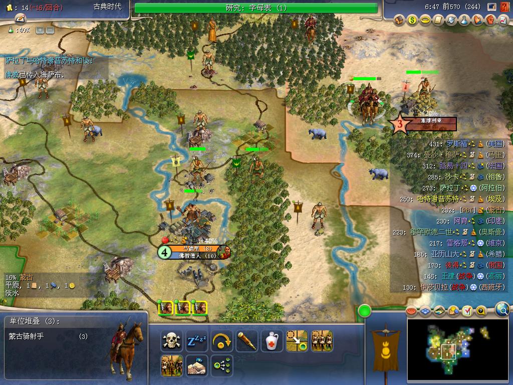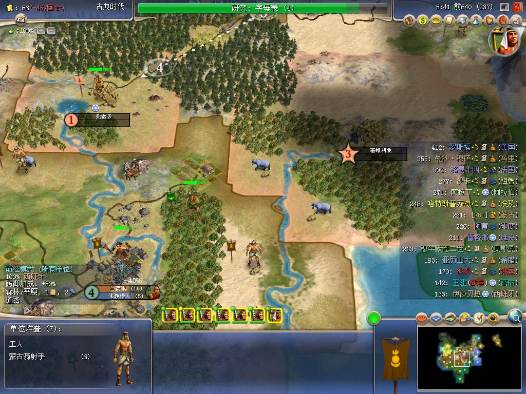 顺便说一下,埃及MM(黄色)已经在我北边沙漠地区放了3座城市(地图上能看出来),正好在我和老萨(最北的淡绿色)之间,在后来起到很关键的作用