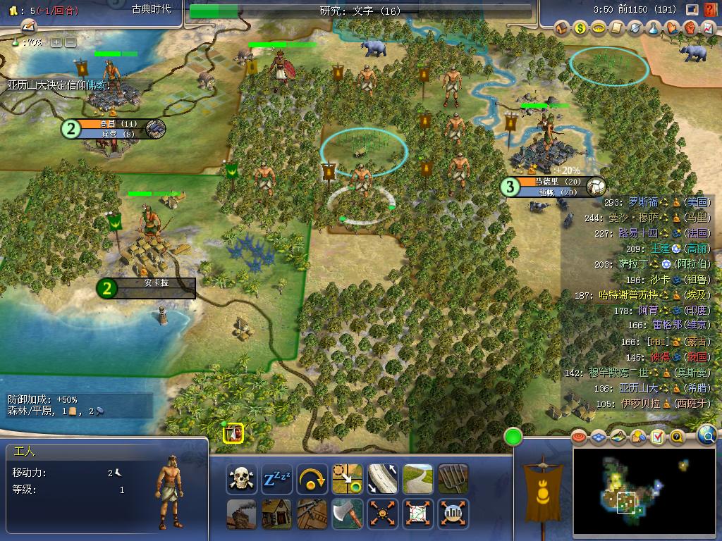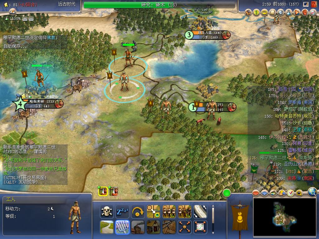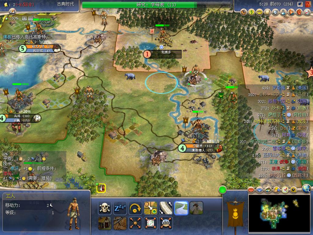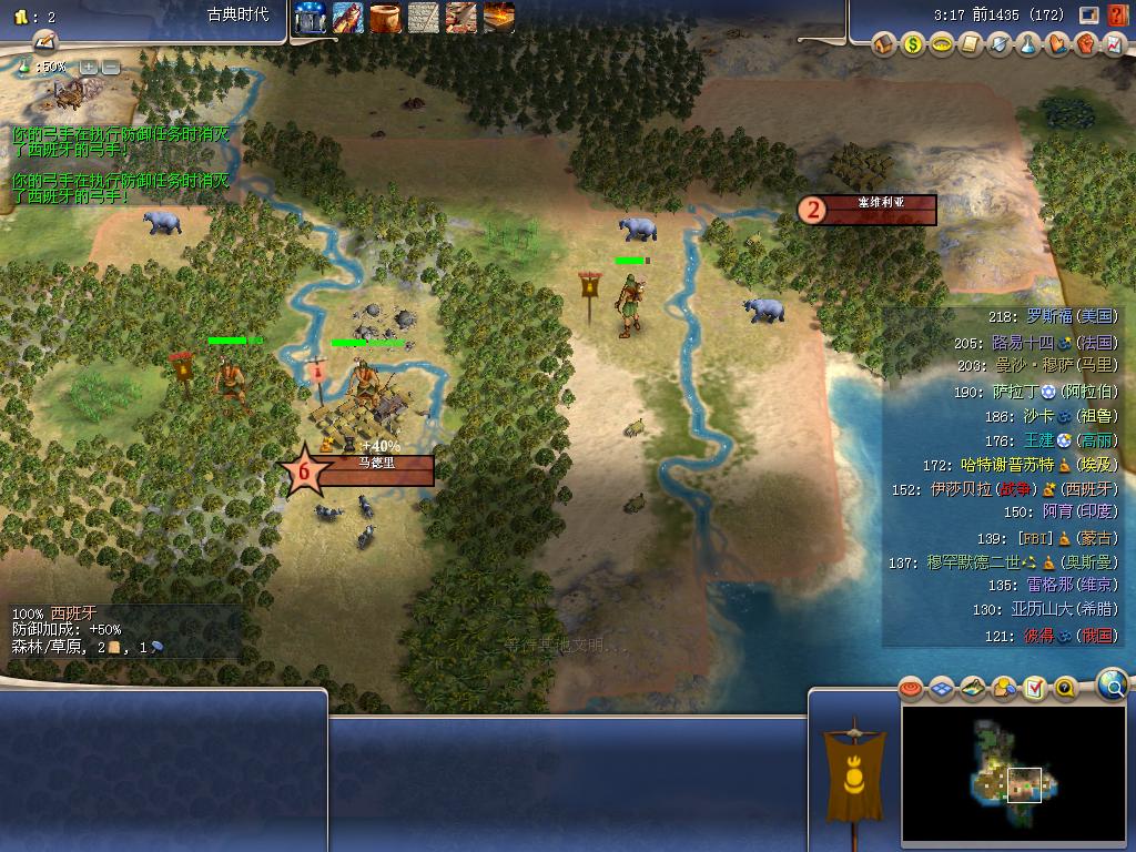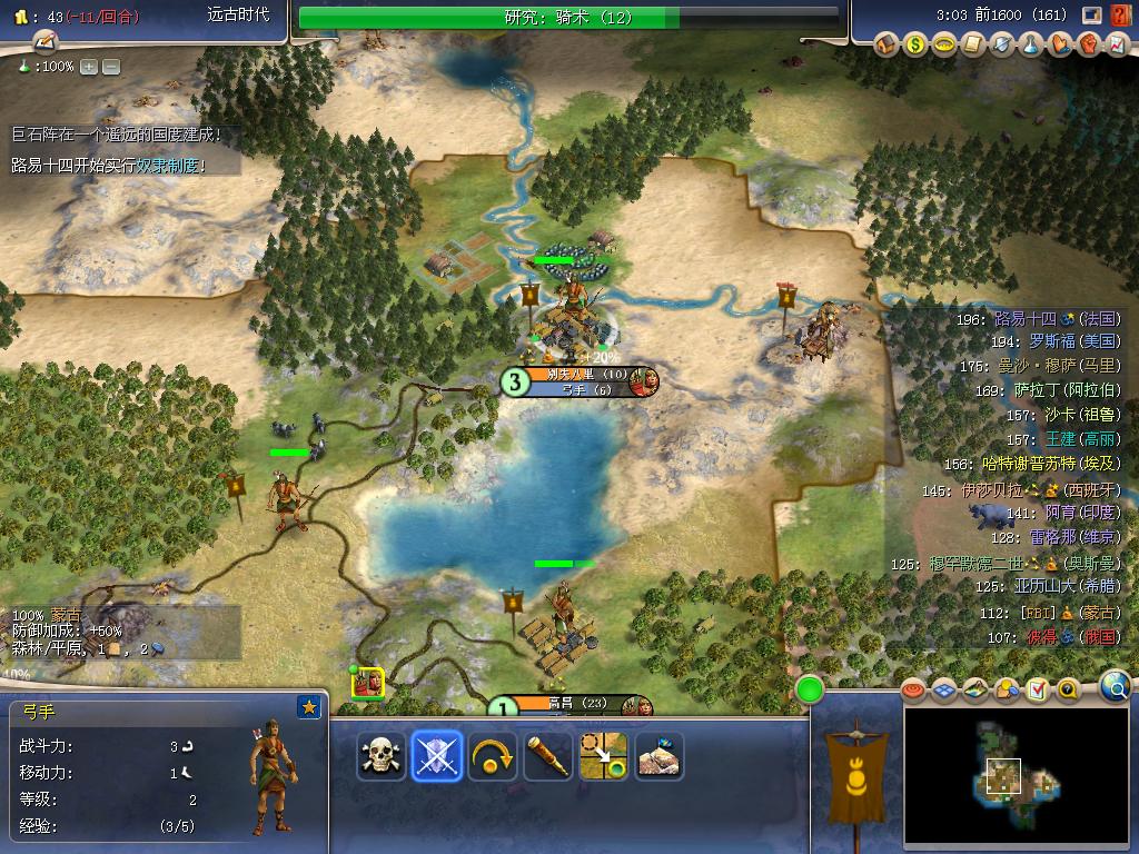 顺便说一下,埃及MM(黄色)已经在我北边沙漠地区放了3座城市(地图上能看出来),正好在我和老萨(最北的淡绿色)之间,在后来起到很关键的作用
