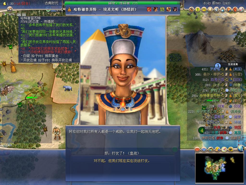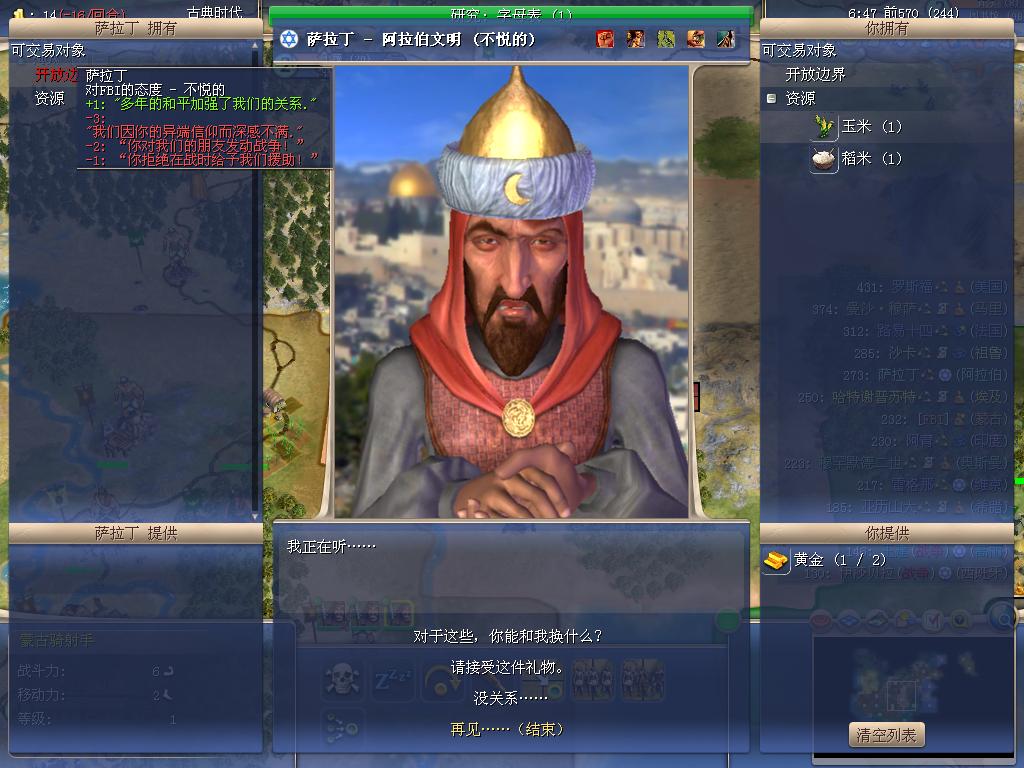 由于埃及与老萨战争结束,我们与老萨的宗教不同关系有点紧张,我北方降城又异常薄弱,所以暂时贿赂他一下