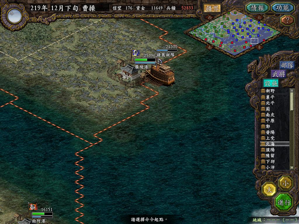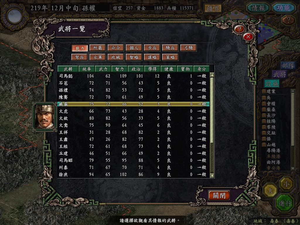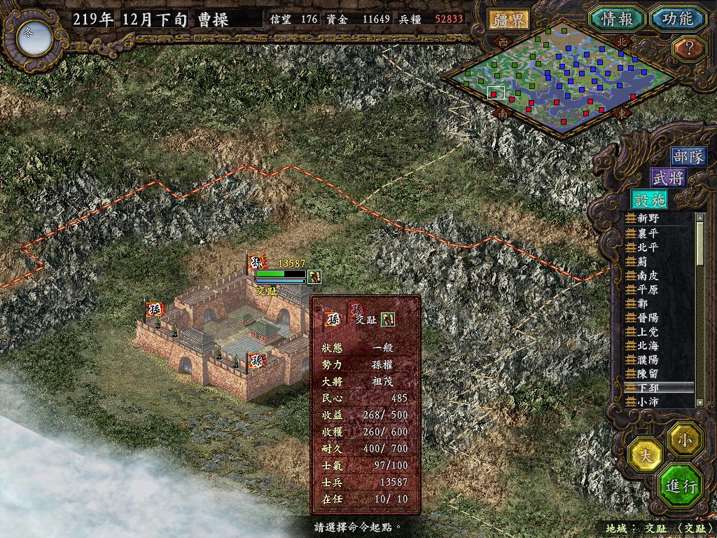 进行面:第二天曹彰就夺取寻阳,吴国各部除孙策由西门杀出,6W2皆呆于城内.夏侯霸部一马当先,发动连锁奔射,公谨损失1300人,剩余300兵马仓皇南逃,郭淮轻骑终于赶上,王双于阵中冲出,当下擒住公谨,三尖刀一闪,公谨重伤落马,徐盛见状,回马来救,拖回主帅,吴兵围上,策见状,大呼:公谨无恙呼!一个奋迅,杀的左翼的王睿人仰马翻.公谨只剩半口气,呻吟曰:既生瑜,何生双!夏侯部的夏侯惠见兄立大功,不甘示弱,文有文用,一个混乱定主公谨,吼道:复呻吟乎?自此瑜部全灭,徐盛为救公谨被俘.策的5000步兵也杀的只剩300人.