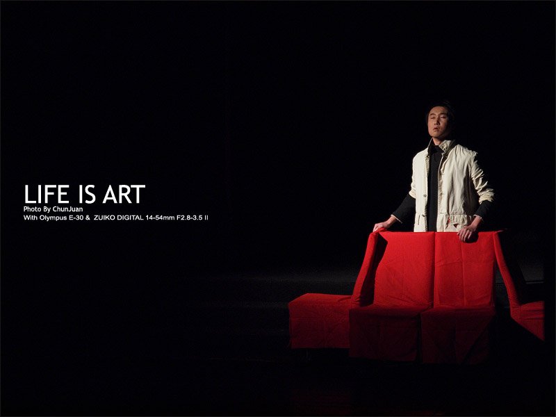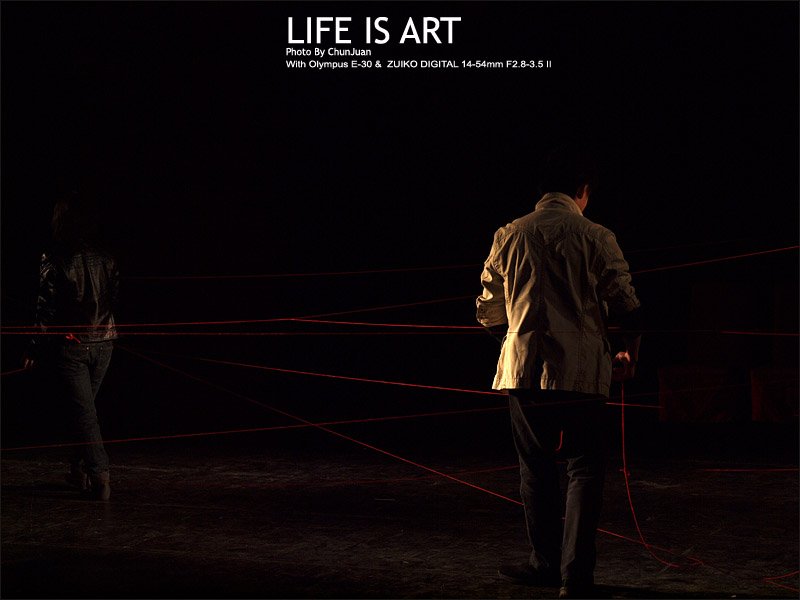 之前猜测昆剧团的新锐独立舞台剧导演又会插段昆曲,不出意外的在这戏里也又一次出现了昆曲的伴奏。我倒是觉得剧中演绎《犀牛》片断那场男女主角牵着红线,最后将红线织罗成一张网的设计很有创意,红线衬在黑色的舞台背景上分外显眼,象征着马路和明明复杂的情感羁绊。最后马路和明明一句台词一刀将红线网在剪刀下彻底剪断,非常的有张力和表现力,象征着马路对明明的爱情如同最后的台词那样:“我已走到所有路的尽头”。这段设计是该戏中舞美的亮点。