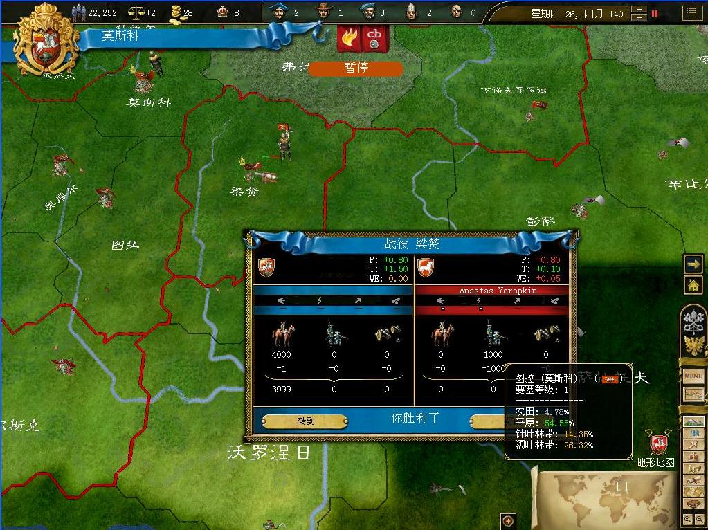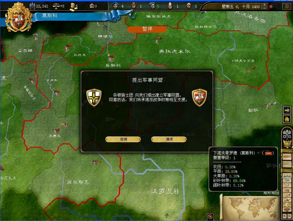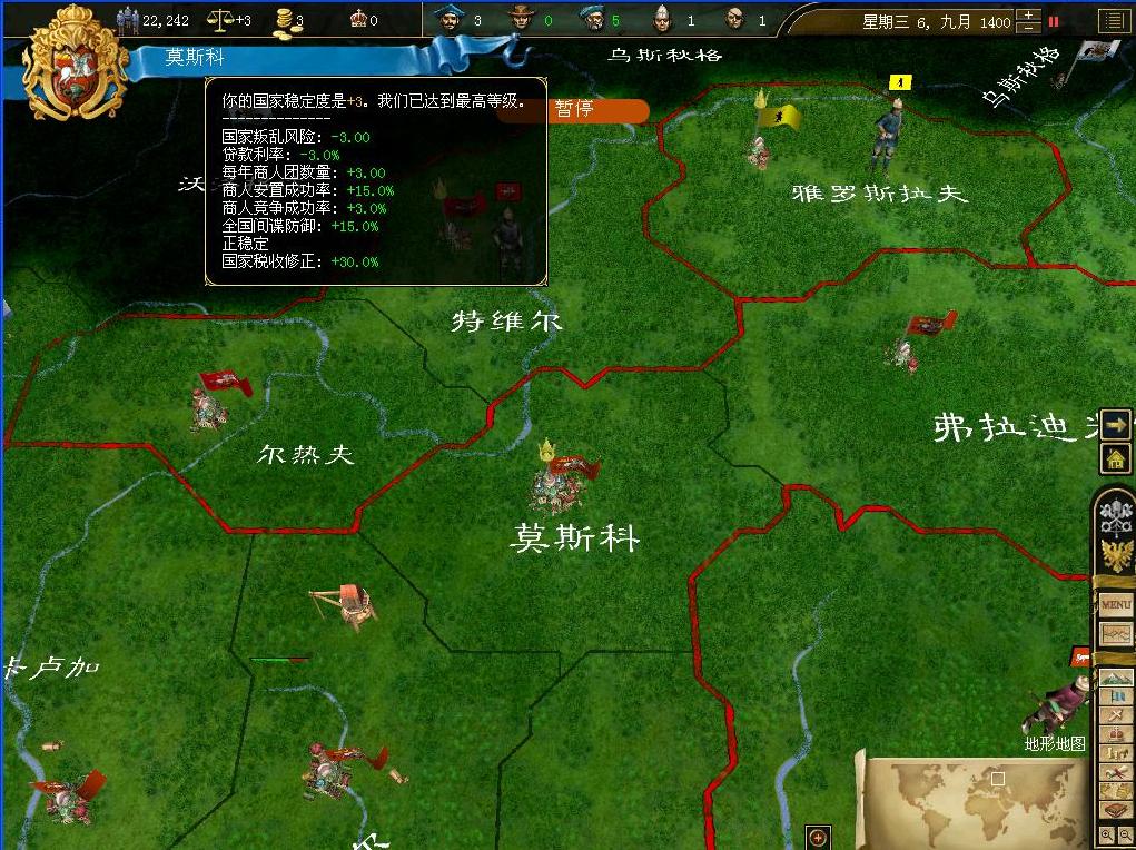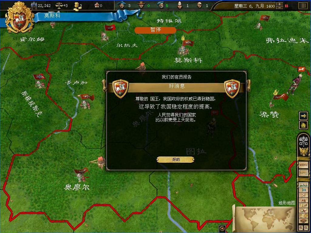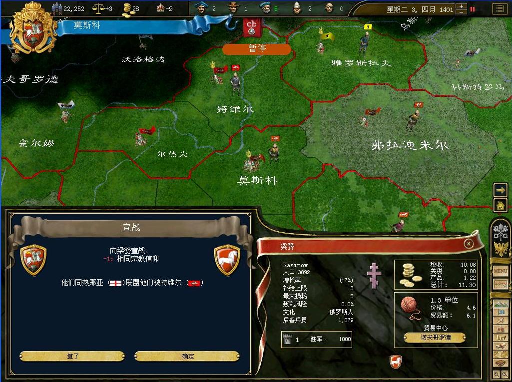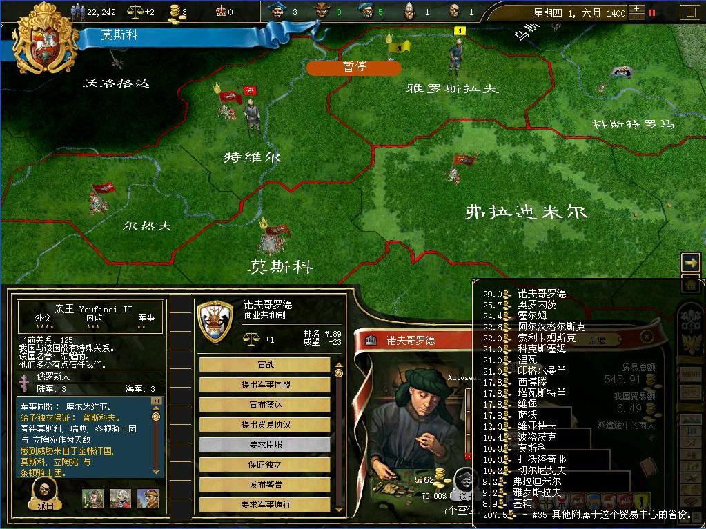 好消息传来,我们的商队终于在诺夫哥罗德立足,而帝国也有了6.49的贸易额.但是这还是远远不足的,更多的商队需要继续派出