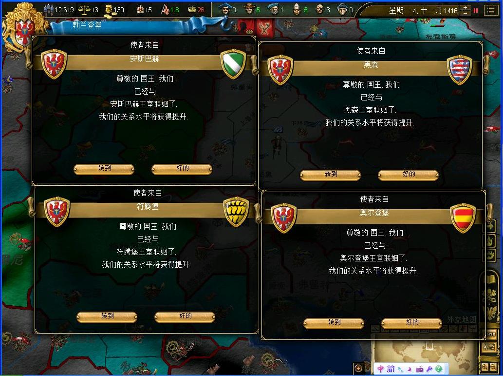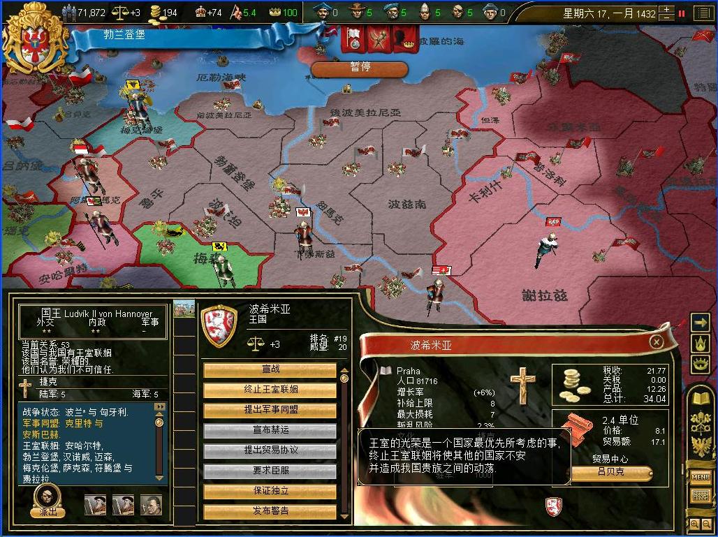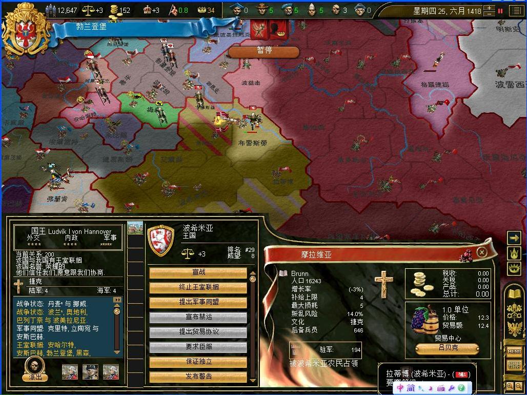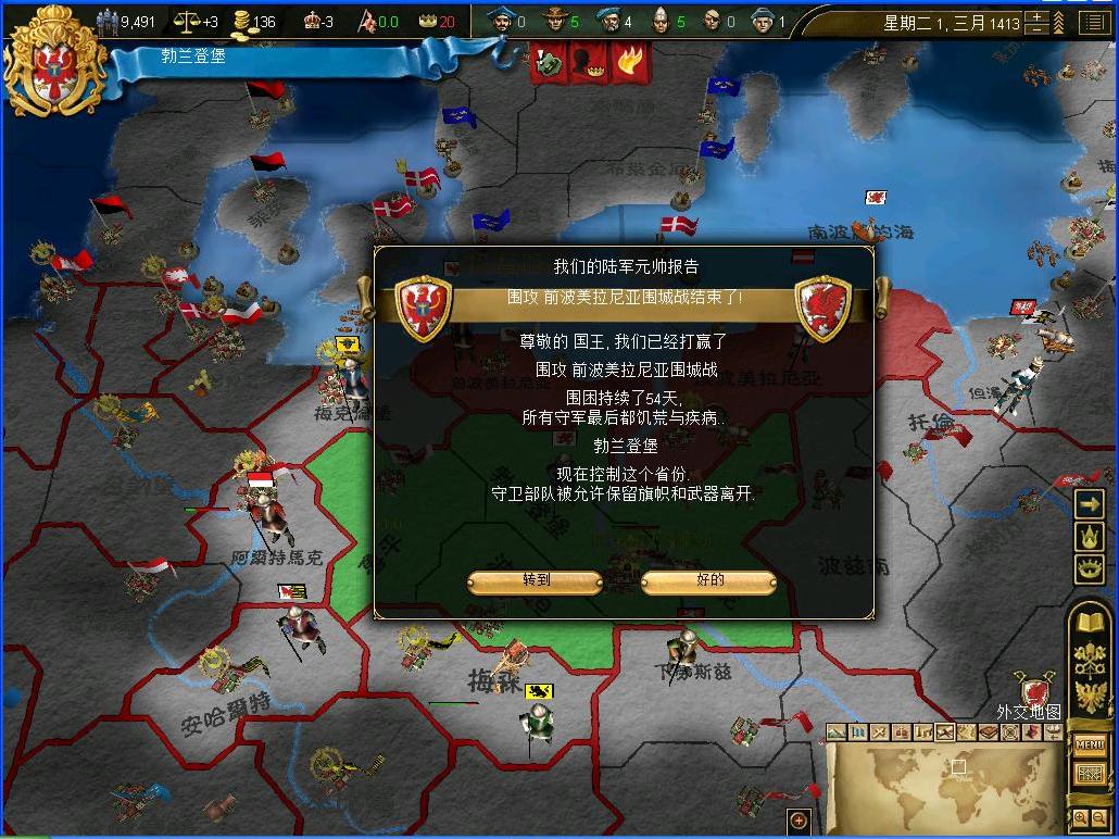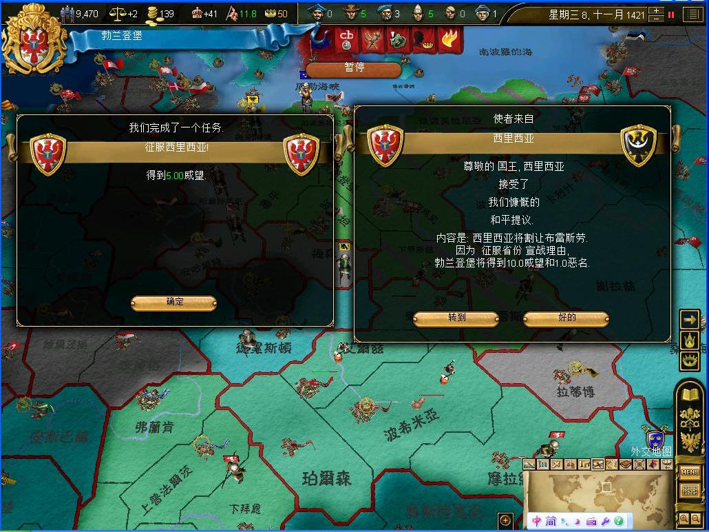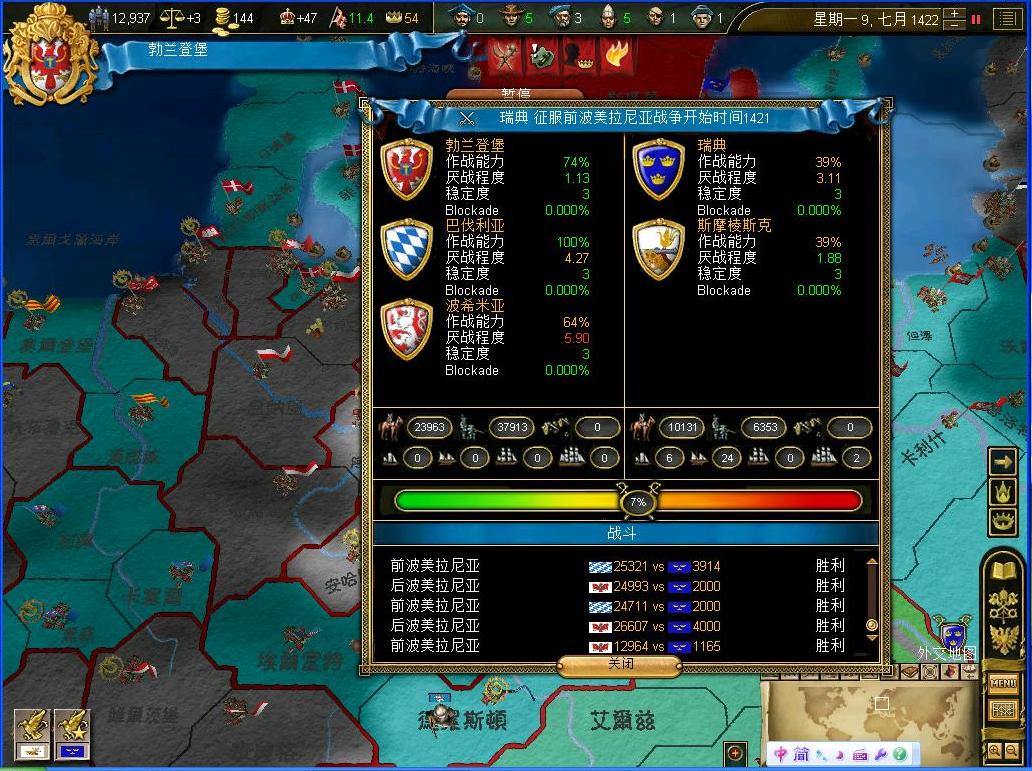 由于将士们和间谍的共同努力,仅仅用了54天就拿下了前波美拉尼亚.来不及停顿,大军迅速杀回首都救驾,在城下歼灭了残军........顺利地完成了任务.考虑后波美拉尼亚在已经被奥地利联军围困,我们没必要去参合这个,还不如早早停战,割下前波美拉尼亚了事.就这样,公国的第一次战争胜利的结束了