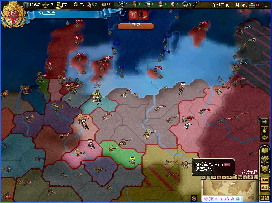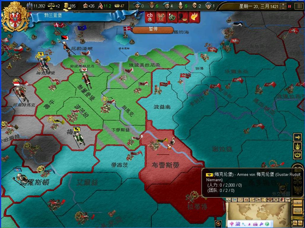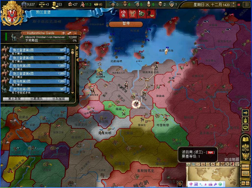 接下来就是要宣战波兰了....突然发现宣战波兰的话.马格德堡也会参战,还不如一起宣Le ,毕竟有核心任务,可以割地不要bb的.所以吧第一军和第二军分别拉到公国的东西两侧,准备同时宣战后亮线作战.西路军估计没有什么问题,东路军需要机动作战了...