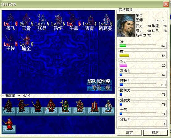 下回合:如果RP好的话,梁红玉物理全档,王横中毒扣血,物理全档,吉汤前进后,诸葛牛鼻子给三人褔星,牛走到桥头,王佐降折彦质上面骑兵的防,由折暴击击退.岳飞给折部褔星,施全给我军四人褔星.友军回合王横双击骑兵,会由侍女击退,由于王横会走出道士放毒范围,侍女顶上,所以道士会向侍女万蛊缠身,而造成侍女的低血.注意不要拿药,要让低血岳帅去吸引敌人(不用管YYP的打法真爽!). (7)