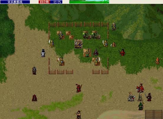 下回合,汤怀触发乌国龙出击.王佐毒死骑兵,张显打道士,施全给王贵补血.(PS:王贵不要打死步兵,打至濒死即可!这样杨BT会走到吹死他!而不是去攻击文官)下回合変成这样.(12)