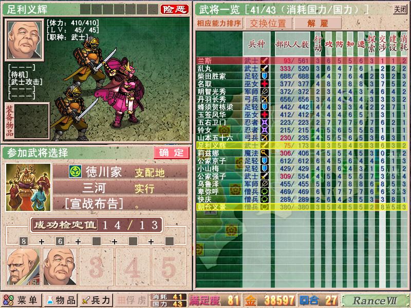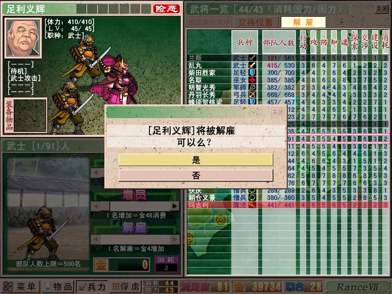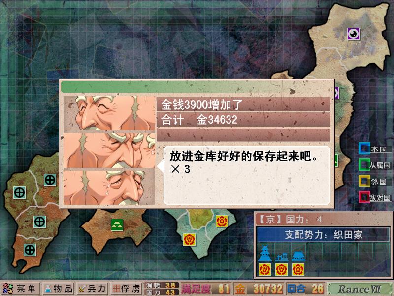 之前挡了巫女机关和朝仓各一波攻击,捕获4个杂鱼,可惜我大军严阵以待,邪马台女王却没有再出现。最近几回合都没有冒头事件了,给兰斯吃个屏风,让他可以在有机会时升下技能,顺手连攻击书一起吃了。